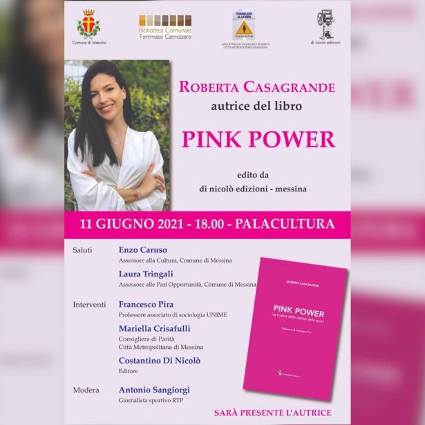Venerdì 11, alle ore 18, nella Sala Palumbo al primo piano del Palacultura, sarà illustrato il libro di Roberta Casagrande “Pink Power. La scalata delle donne dello sport”, edito dalla casa editrice messinese Di Nicolò. Prosegue così il Maggio dei Libri 2021, con altre presentazioni di libri che non si sono potute svolgere in presenza in quanto nelle prime settimane di maggio la Sicilia era ancora in zona arancione. All’incontro, moderato da Antonio Sangiorgi, giornalista sportivo RTP, ai saluti degli Assessori alla Cultura Enzo Caruso ed alle Pari Opportunità Laura Tringali, seguiranno gli interventi di Francesco Pira, professore associato di sociologia UNIME; Mariella Crisafulli, consigliera di Parità Città Metropolitana di Messina e Costantino Di Nicolò, editore. Il libro si occupa della discriminazione di genere nel mondo del giornalismo sportivo e dello sport, un tema che coinvolge l’etica della comunicazione e non solo. Ancora oggi la donna viene raffigurata come mamma e casalinga, ben lontana dall’essere il simbolo dello sport. Si pensa sempre ad una figura quanto più possibile maschile e virile, che dia esempio di forza, solidità e austerità quasi a snobbare la presenza femminile in campo sportivo.