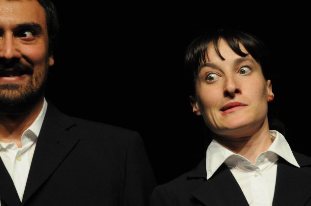 “Invisibilmente” della compagnia Menoventi di Ravenna è diventato in questi ultimi anni un piccolo classico. Scritto da Consuelo Battiston, Alessandro Miele (che lo interpretano) e Gianni Farina (che è il regista) avrebbe voluto essere uno spettacolo sul giudizio universale, «però ci serviva un elefante e la produzione si è ostinata a non volerlo acquistare. Quindi abbiamo fatto un’altra cosa». E sono partiti da una frase della “Genesi”: «Allora si aprirono gli occhi di tutti e due e si accorsero di essere nudi». Conseguenza? «Oppressi da un forte controllo, due malcapitati devono affrontare uno strano scherzo del destino. I sotterfugi per girare a loro favore la situazione si rivelano tutti vani. Braccati non hanno tregua. Bloccati, vengono tenuti continuamente sottocchio. Cosa resta loro da fare? Nascondersi sotto gli occhi di tutti».