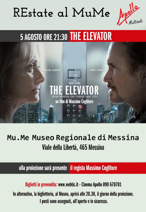 Giovedì 5 agosto il regista messinese Massimo Coglitore propone il thriller dal respiro internazionale “The Elevator” e incontra il pubblico, presentando il film. Un thriller psicologico girato in lingua inglese e ispirato a una storia vera. La produzione è di Riccardo Neri per Lupin film. “The Elevator”, scritto da Riccardo Irrera e Mauro Graiani, è la storia di Jack Tramell, impersonato da James Parks, un presentatore che conduce un popolarissimo quiz televisivo negli Stati Uniti, tenuto in ostaggio in ascensore dalla misteriosa Katherine, che a torto o ragione lo ritiene responsabile della morte del figlio. “La nostra – sottolinea il regista – è una produzione ideale per il mercato internazionale, come dimostrano i riscontri ottenuti. James Parks, Caroline Goodall, premiata per l’occasione come migliore attrice alla XIV edizione del Rome Independent Film Festival, e Burt Young (“Rocky”) sono interpreti straordinari. In un film così difficile da girare, in uno spazio chiuso, mi sono messo al loro servizio. In più, la fotografia è di Vincenzo Carpineta, le musiche di Stefano Caprioli, i costumi di Nicoletta Ercole, le scenografie di Tonino Zera e il montaggio di Osvaldo Bargero e Susanna Scarpa: tutti ottimi professionisti”, evidenzia il regista Massimo Coglitore.