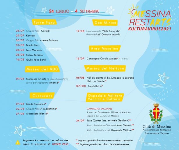 Completato il cartellone estivo degli eventi promossi dall’Amministrazione comunale nell’ambito del progetto “Kulturavirus, il contagio che fa bene alla salute”, approvato con Delibera di Giunta n. 660 del 27 novembre scorso, per la promozione di iniziative culturali e di spettacolo nell’ambito delle misure adottate dall’Amministrazione comunale per sostenere i lavoratori dello spettacolo, duramente penalizzati dal triste periodo di pandemia, ed offrire alla cittadinanza e ai turisti presenti in città, momenti culturali, musicali, di svago e divertimento. Delle oltre cinquanta proposte prevenute, alcune sono state accettate sotto forma di video, e saranno trasmesse in streaming sulla pagina Fb “kulturavirus” e sul canale youtube del Comune, altre inserite nel calendario “Messina Restarts – Kulturavirus2021”. Per assistere agli spettacoli in programma, con inizio alle ore 21.30, tutti ad ingresso gratuito, è necessaria la prenotazione sino al numero massimo di spettatori consentito. Gli spettacoli in programma si svolgono a Torre Faro (isola pedonale), al Museo del 900, a Curcuraci, da Don Minico, all’Area Musolino, e alla Marina del Nettuno. Si ricorda che a partire da lunedì 6 agosto è indispensabile esibire per all’ingresso alle location il Green pass, come da decreto legge, pubblicato sulla Gazzetta Ufficiale del 23 luglio 2021.