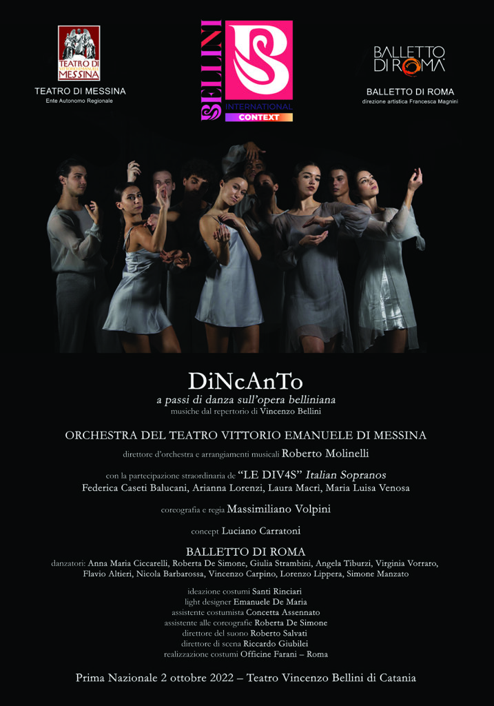 DiNcAnTo - A passi di danza sull’opera Belliniana. Omaggio al belcanto Belliniano sarà un percorso danzato che emerge dalle suggestioni e visioni di una terra, per l’appunto, incantata, caratterizzata da elementi naturali di cui il grande musicista siciliano si è nutrito durante la sua intensa, seppur breve, carriera musicale. Quattro soprani Le DIV4S, quattro personaggi femminili: Norma, Giulietta, Amina, Elvira. Quattro elementi a rappresentare la Sicilia di Bellini: l'Acqua del mare che lo ha accompagnato per tutta la sua giovinezza, ma anche il mare tumultuoso e temibile del suo primo viaggio verso Napoli; l'Aria con i profumi straordinari di una terra unica, l'aria che disegna con le nuvole sopra il Vulcano; la Terra, con i suoi frutti carichi di colore e di sapore, la terra delle radici inestirpabili; il Fuoco di un Vulcano indomabile, che diventa il fuoco sacro di Norma e che diventa infine il fuoco interiore della malattia che lo ha divorato, concludendo con Casta Diva come un canto sacro che accompagna il viaggio di ritorno di Bellini verso la terra Madre. Questi elementi, fonte di vita, restituiranno al pubblico la mente e il cuore di un grande musicista la cui arte continua a incantare platee di tutto il mondo, tra immensità e bellezza.