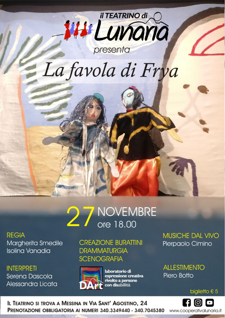 La compagnia Il Teatrino di Lunaria vi invita allo spettacolo di burattini “La favola di Frya” domenica 27 novembre 2022 ore 18.00 da Lunaria, in via Sant'Agostino 24, Messina