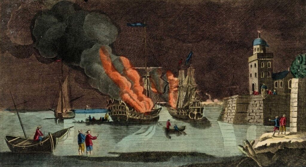 Jean Francois DUMONT (Rouen 1667 - Vienna 1727) “Vaisseaux en feu dans le Port de Messine” Parigi, 1750 ca, incisione in rame su carta, acquerellata a mano, cm 21,5 x 39 (parte incisa). Vues d'optique