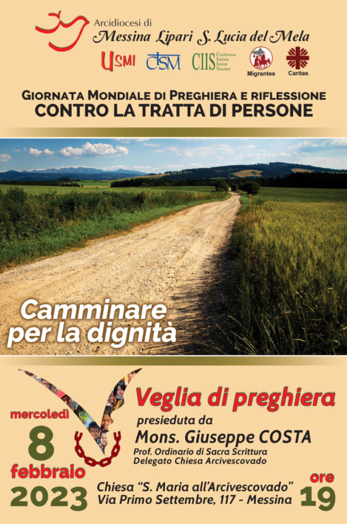 In occasione della IX Giornata Mondiale di Preghiera e Riflessione contro la Tratta di persone, mercoledì 8 febbraio alle ore 19, presso la chiesa di “S. Maria all’Arcivescovado” (via Primo Settembre, 117 - Messina), si terrà una Veglia di preghiera presieduta da mons. Giuseppe COSTA, Professore Ordinario di Sacra Scrittura e Delegato Chiesa Arcivescovado. L’evento è promosso dalle religiose dell’USMI, dai religiosi del CISM, dai membri degli Istituti Secolari, dall’Ufficio diocesano Migrantes e dalla Caritas diocesana.