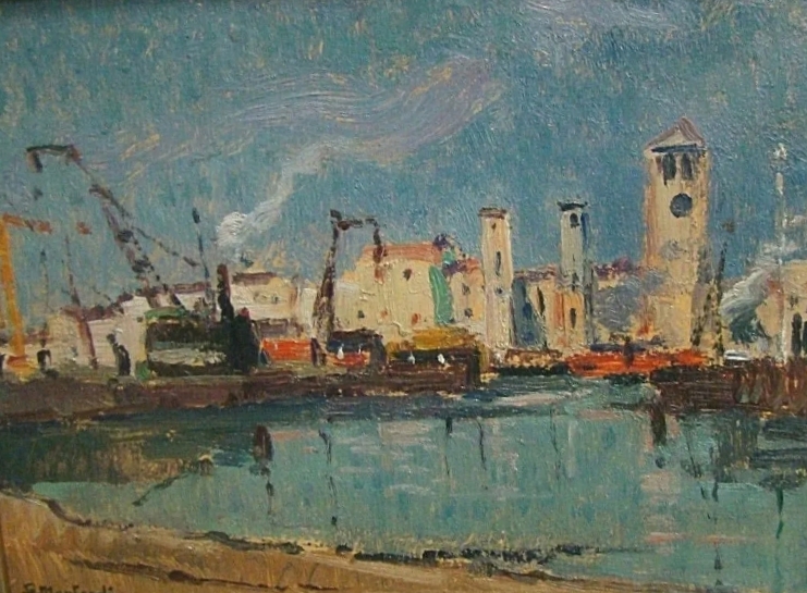 Sergio Manfredi (Torino, 1932) "Vecchio porto - Savona" 1968 - olio su cartone pressato, cm 18 x 24