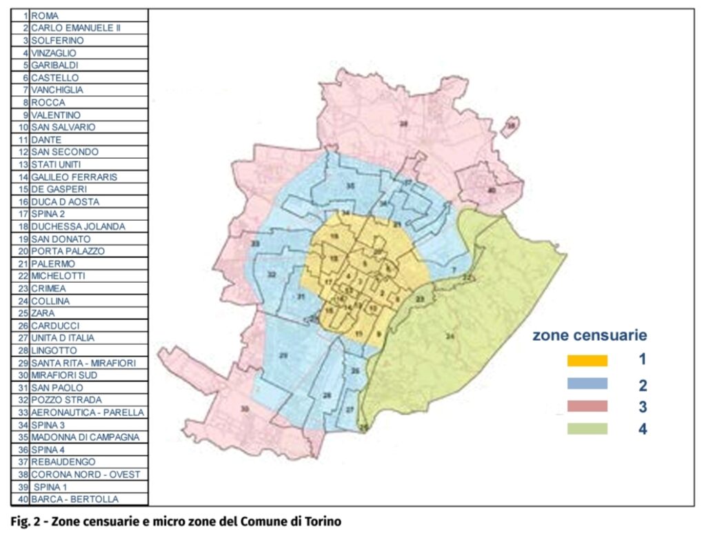 Per il catasto vigente la città di Torino è divisa in 4 zone: centro, semicentro, periferia e collina; ciascuna zona censuaria con propri valori unitari in funzione della classificazione dell’alloggio in termini di categoria e classe. In conformità al DPR 138/1998, il Consiglio Comunale di Torino ha approvato nel 1999 la suddivisione della città in 40 zone omogenee, da assumere come segmenti di mercato da monitorizzare. La fig.2 mostra il perimetro di Torino suddiviso tanto nelle 4 zone censuarie vigenti, quanto nelle 40 micro zone.