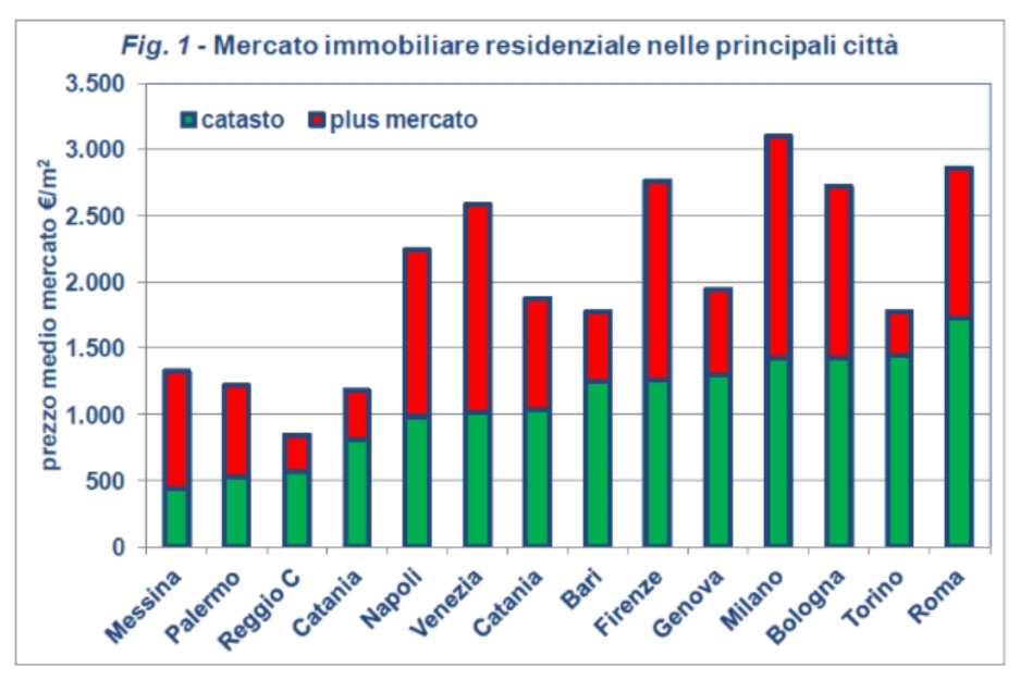 Il patrimonio edilizio italiano destinato alle abitazioni, risultante dalla banca dati OMI (Osservatorio del Mercato Immobiliare dell’Agenzia delle Entrate), è costituito da 35'177’711 unità, con una superficie media pari a 117 m2 (corrispondente a 5,5 vani), per una rendita catastale media di € 488. Il valore catastale medio delle abitazioni, calcolato in conformità all’imposizione IMU (rendita incrementata del 5% e moltiplicata per 160) risulta pertanto € 81'961, in termini di superficie unitaria 698 €/m2. Ergo il valore catastale complessivo delle abitazioni risulta essere 2’883 miliardi di euro.