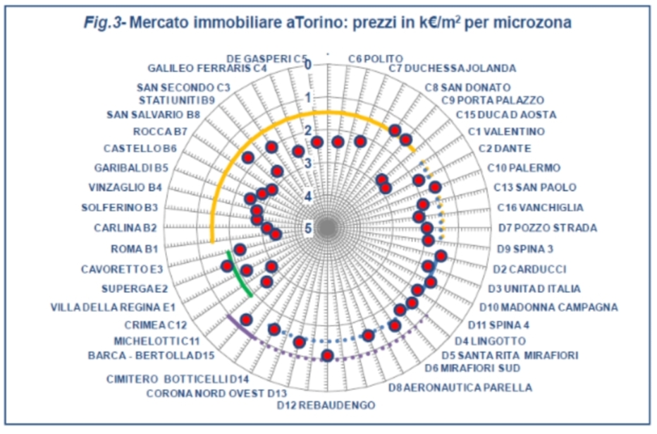 Il risultato dell’esercizio è riportato nel grafico polare di fig. 3, dove per completezza sono state riportate tutte le micro zone, tanto quelle interamente contenute in un’unica zona censuaria, quanto quelle divise su più zone. I prezzi di mercato sono rappresentati dai punti, i valori di mercato con delle linee colorate con i colori della mappa di fig. 2. Linee puntinate sono state usate per le micro zone appartenenti a più zone censuarie.