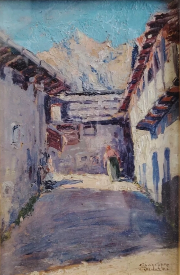 Giuseppe Gheduzzi - "Borgo di montagna" olio su tavoletta, 28 x 17,5