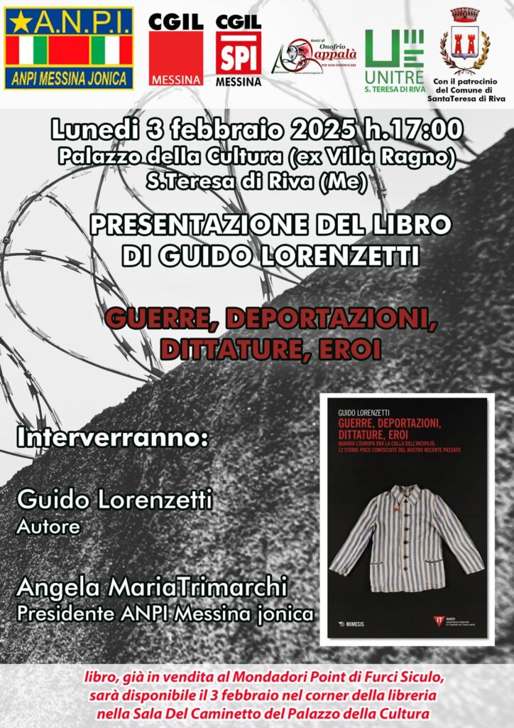 Lunedì 3 febbraio 2025, alle ore 17, presso il Palazzo della cultura (ex Villa Ragno) di Santa Teresa di Riva, sarà presentato il libro di Guido Lorenzetti, Guerre, deportazioni, dittature, eroi. Quando l’Europa era la culla dell’inciviltà. 12 storie poco conosciute del nostro recente passato.