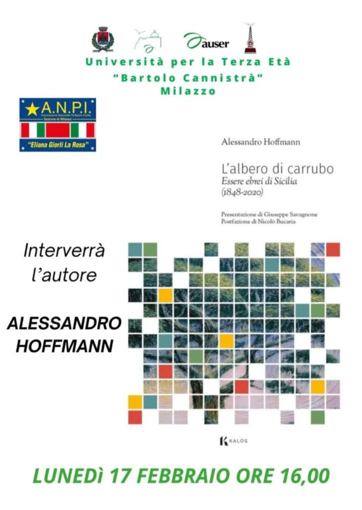 Lunedì 17 febbraio 2025, alle ore 16 nei locali dell'Istituto tecnico Industriale 'Ettore Majorana' di Milazzo, l'Anpi di Milazzo e la Lute di Milazzo, presentano il libro 'L'albero di carrubo. Essere ebrei di Sicilia (1848-2020)' di Alessandro Hoffmann.