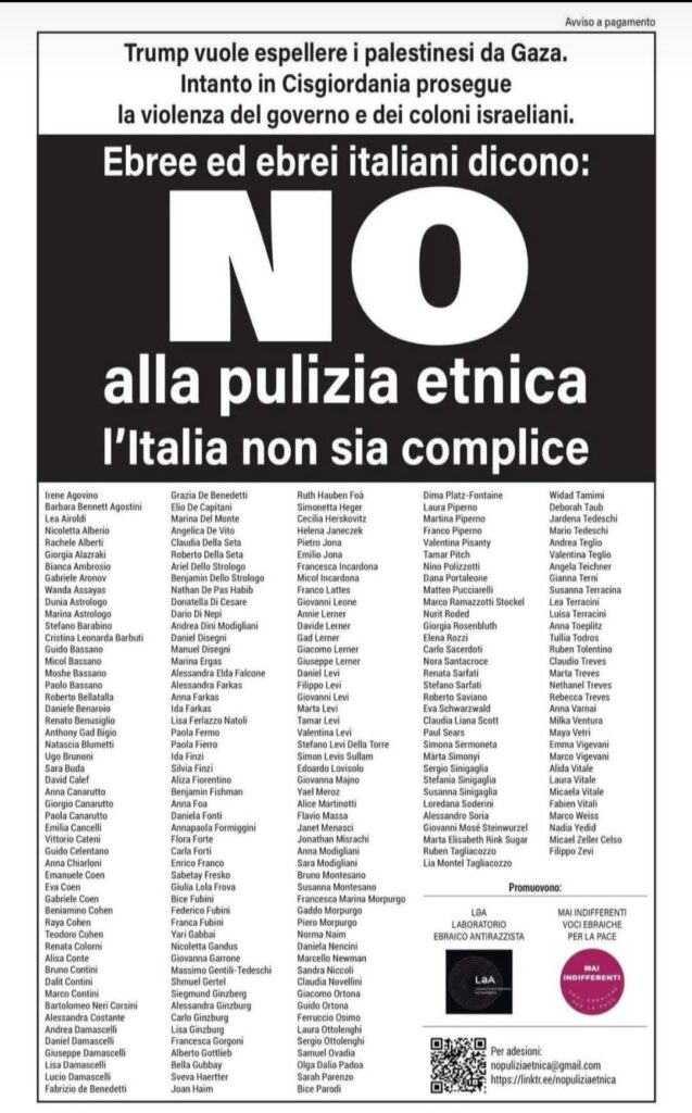 Ebrei ed ebree italiani dicono: NO alla pulizia etnica. L’Italia non sia complice