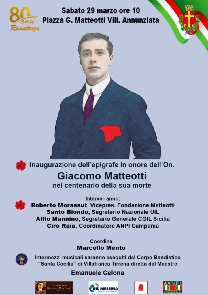 A distanza di 101 anni dal suo abbietto assassinio per mano fascista, la città e i lavoratori di Messina ricordano Giacomo Matteotti, simbolo di libertà e giustizia sociale. Lo fanno con una lapide che sarà scoperta sabato 29 marzo, alle ore 10, nella villetta che in città porta il suo nome, al rione Annunziata. L’iniziativa è stata presa dall’Anpi, dalla Cgil e dalla Uil di Messina, che invitano tutta la cittadinanza a partecipare alla cerimonia.