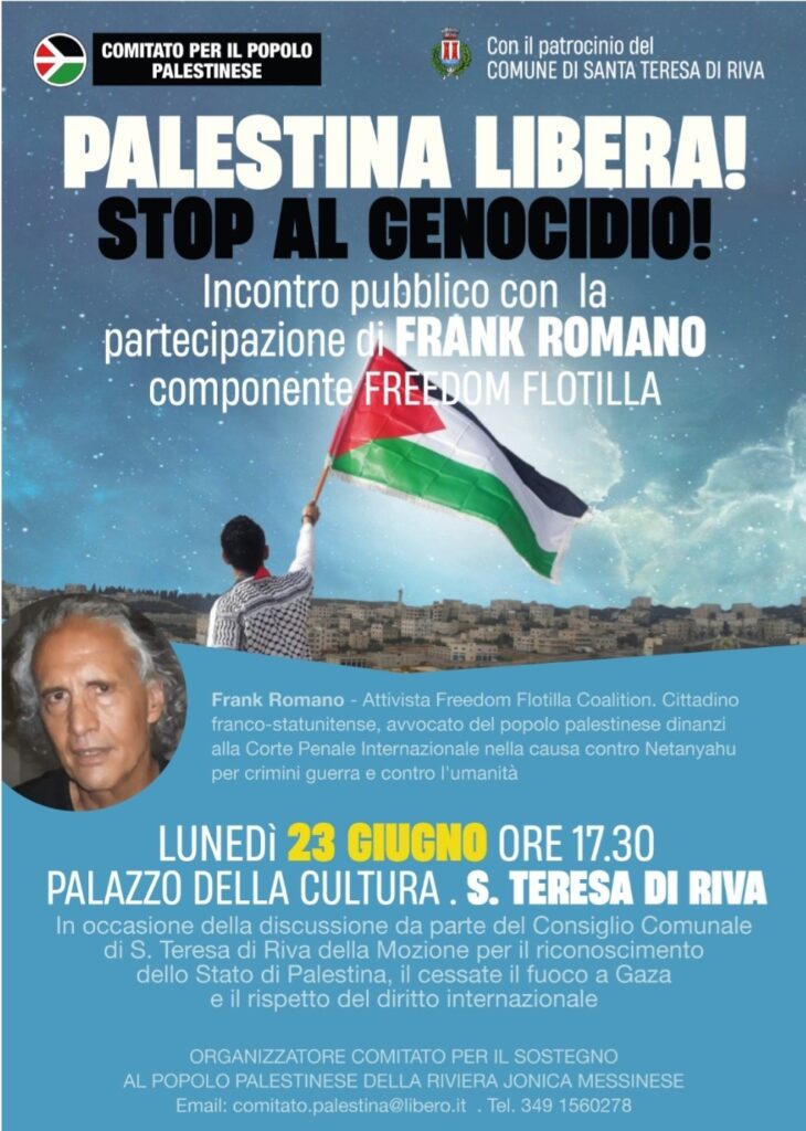 Durante la seduta consiliare interverrà anche Frank Romano (Freedom Flotilla, avvocato presso Corte Penale Internazionale).