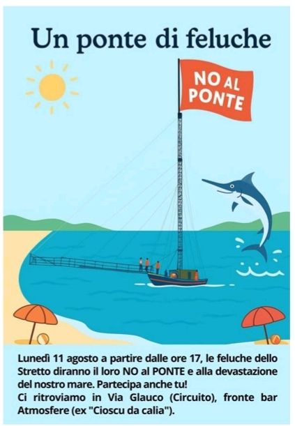 Lunedì 11 agosto alcune Feluche esporranno la bandiera No Ponte per esprimere la loro opinione riguardo al progetto. Saranno unite da questa intenzione barche di entrambe le sponde dello Stretto di Messina. Le associazioni che intendono stringersi attorno al comparto di imprenditori impegnati nella tradizionale pesca del pesce spada, e coloro che ritengono l’opera inutile, anacronistica per le esigenze di trasporto, o dannosa per il territorio e le associazioni che sostengono detta iniziativa si raduneranno a Torre Farò in via Glauco (circuito) alle ore 17:00.
