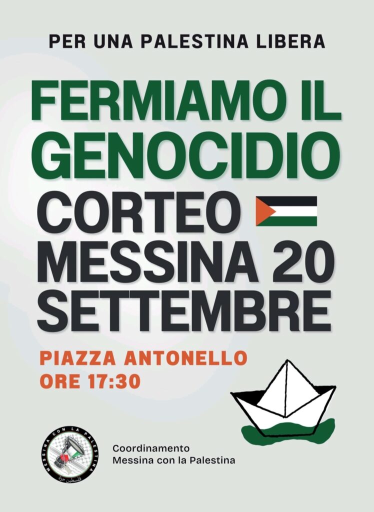 Coordinamento Messina per la Palestina sabato 20 settembre 2025 CORTEO MESSINA A SOSTEGNO DELLA GLOBAL SUMUD FLOTILLA concentramento ore 17.30, piazza Antonello