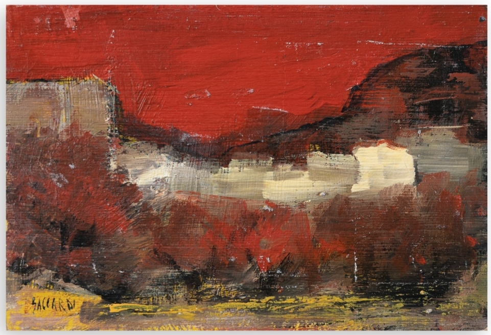 Carlo Saccardi (Montebello della Battaglia, 1921 - Milano, 1997) "Paesaggio al tramonto" - olio su masonite, cm 20,5 x 30,0