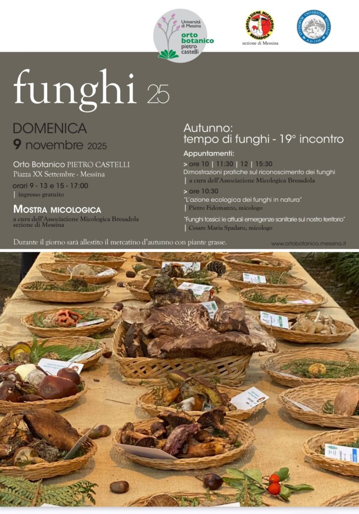 Domenica 9 novembre l’Orto Botanico “Pietro Castelli” dell’Università di Messina ospiterà l’annuale incontro per gli appassionati di Funghi. Siamo giunti alla diciannovesima edizione e anche quest’anno i soci della sezione di Messina dell’Associazione Micologica Bresadola allestiranno un'esposizione di funghi freschi nei viali dell’Orto Botanico.