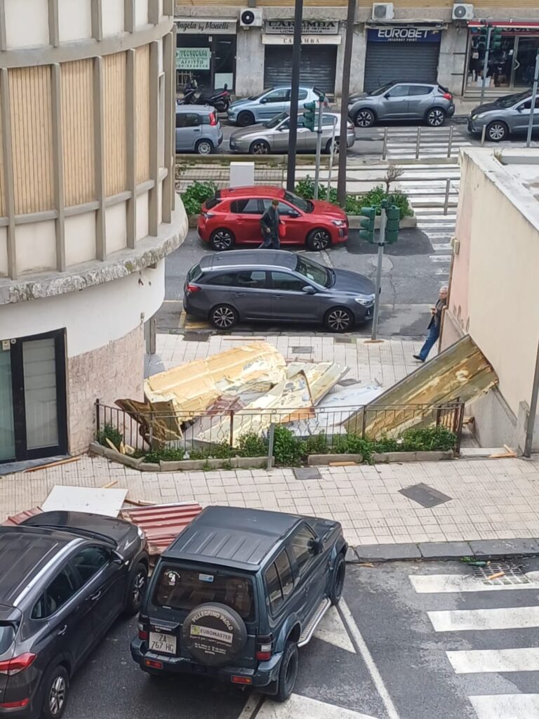 Il forte vento che sta caratterizzando il pomeriggio del giovedì 12 febbraio tra i vari problemi, rami spezzati, alberi e segnaletica divelta ha scoperchiato una casa in via Giuseppe Bottone. Il tetto trascinato dal vento ha sorvolato la via Catania ed è caduto sul marciapiedi del viale San Martino. Fortunatamente né pedoni né automobili di passaggio sono state coinvolti. Alcune auto parcheggiate sono state danneggiate. Sul posto è intervenuta la polizia urbana.
